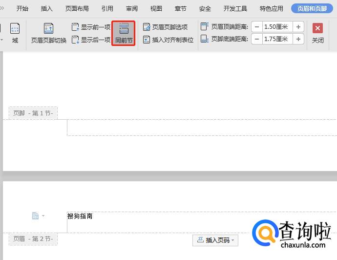 然后再将光标放在处理页面,点击插入选项下的【页眉和页脚】,然后在弹出的页面中点击“同前节”选项。