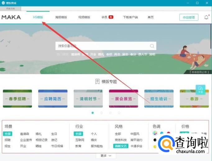 在模板商城找到H5模板,你可以对模板场景,行业,风格,色调,价格等进行设置: