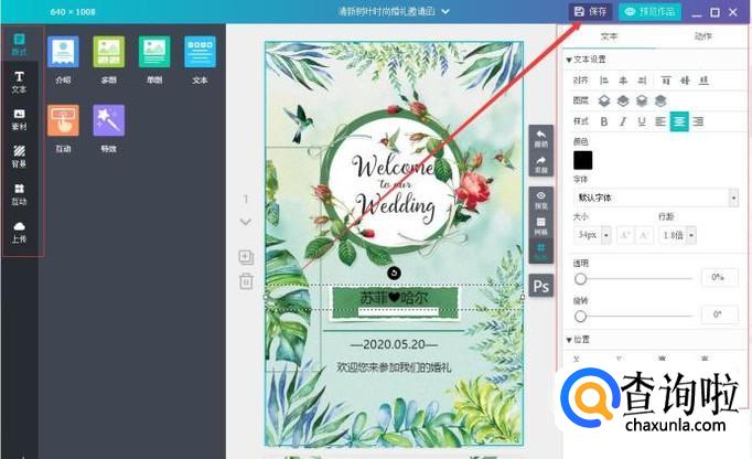 对页面内容进行修改,文本及动作进行修改,不需要的内容进行删减,直到满意为准,可保存查看效果,预览作品进行发布。