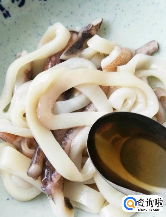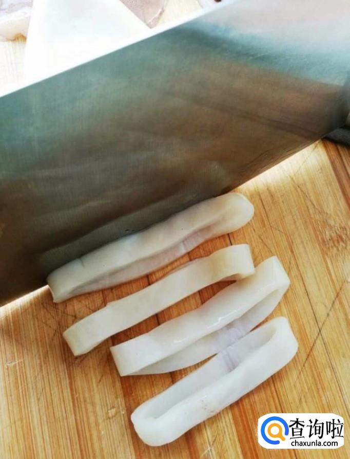 首先我们将鱿鱼处理干净,用刀切成圈备用