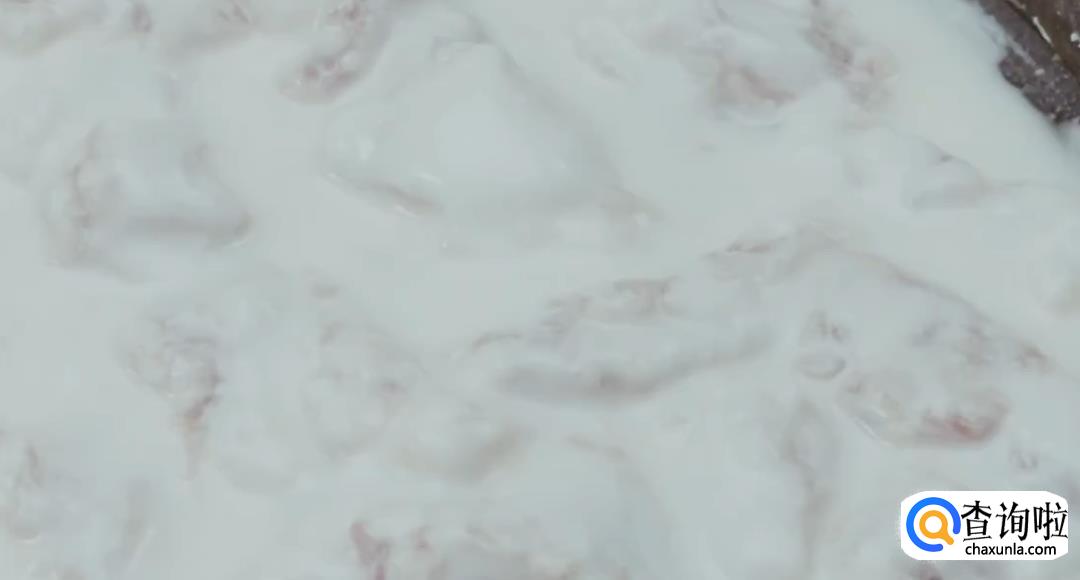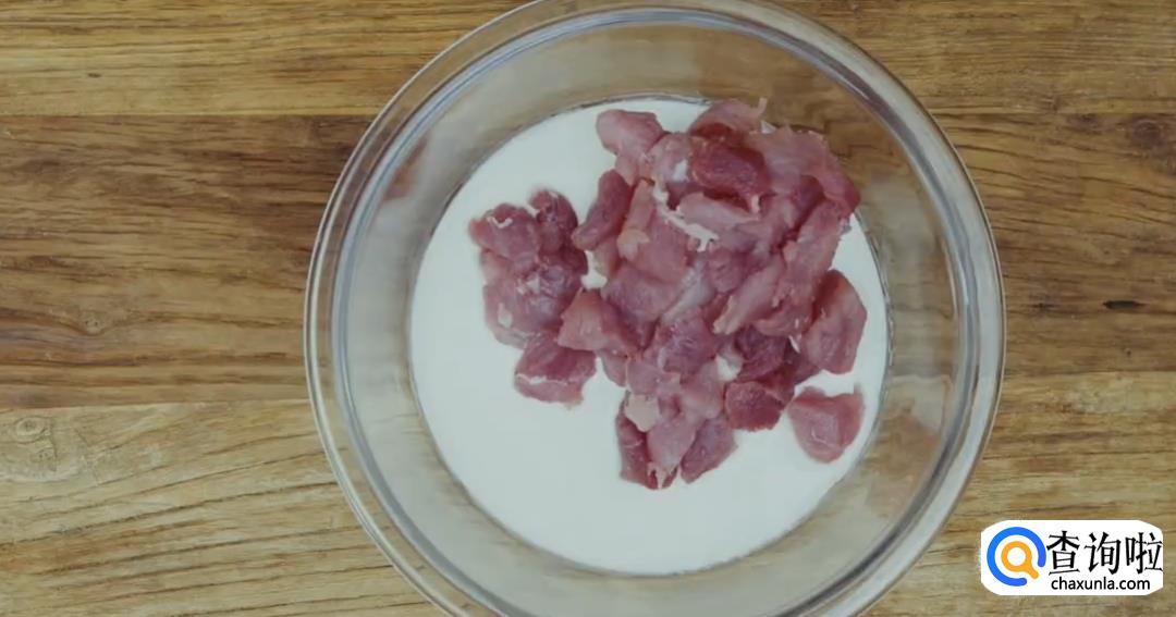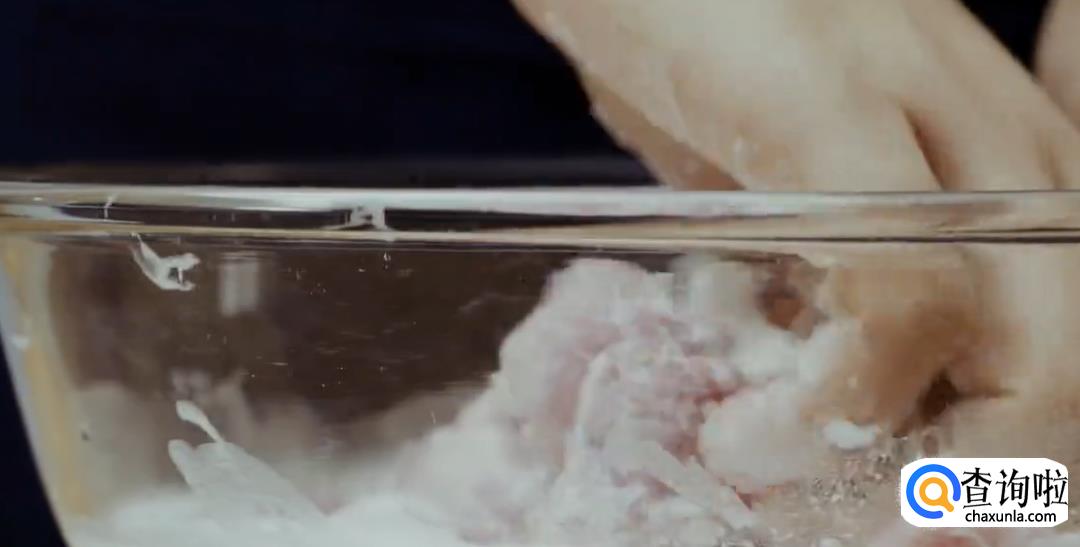 将水淀粉静置,只留下淀粉部分,然后将里脊肉倒入,用手抓匀。