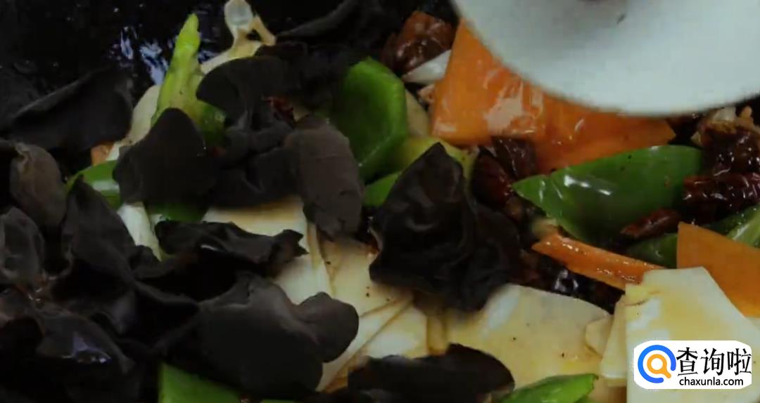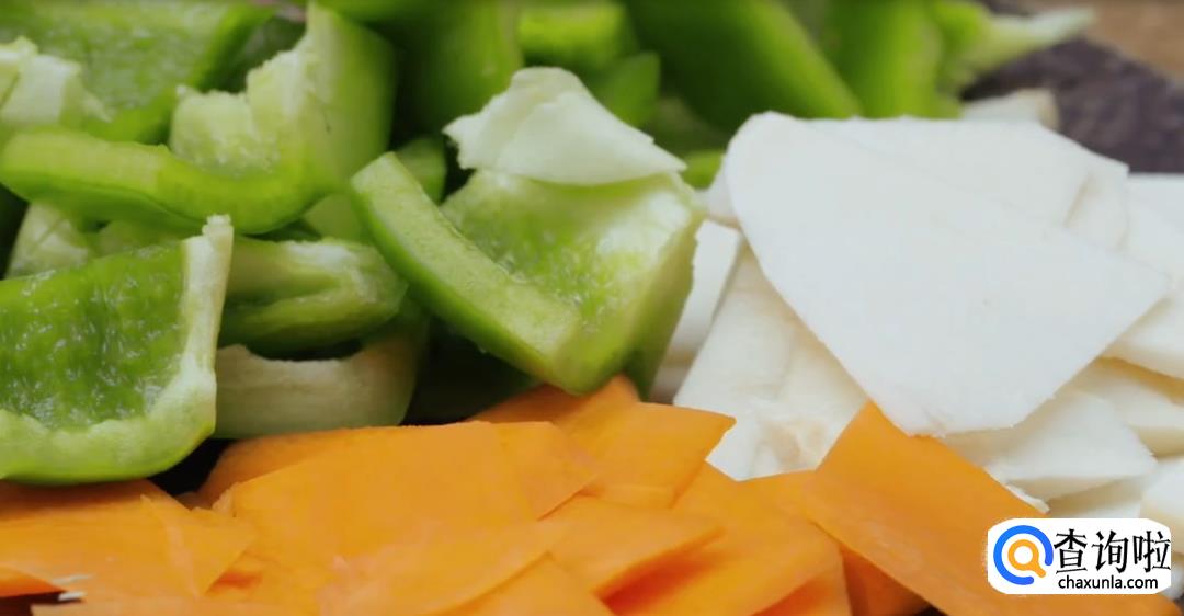 将猪里脊肉切成1.5厘米大小的小块。木耳泡发后撕碎。青椒,胡萝卜,冬笋切片。