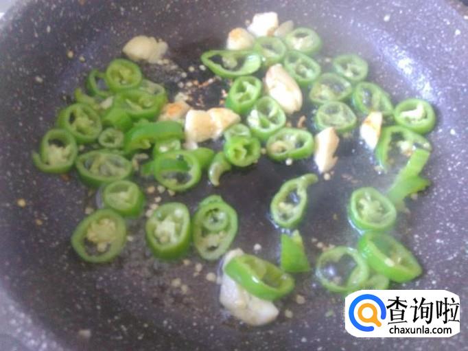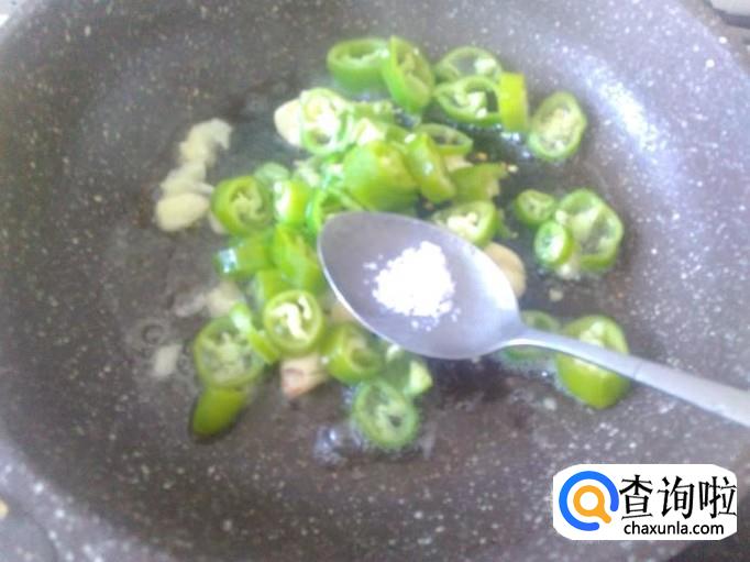 青椒下锅,加适量的盐,然后把青椒翻炒出辣味来。