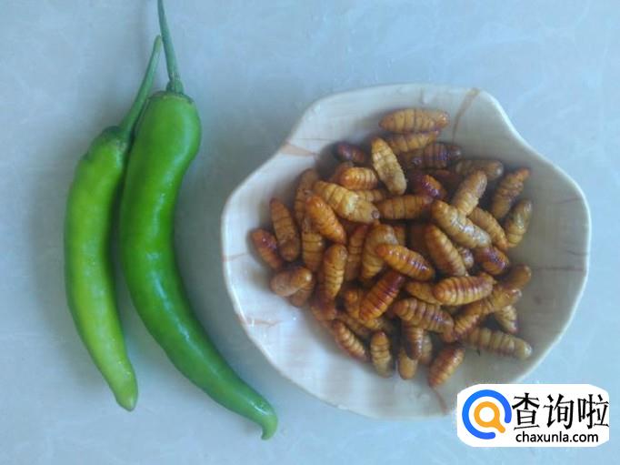 青椒选择辣点的,青椒、蚕蛹准备好。