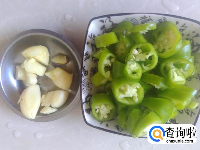 青椒清洗干净切成小圈,蒜米准备好。