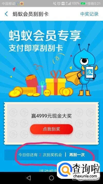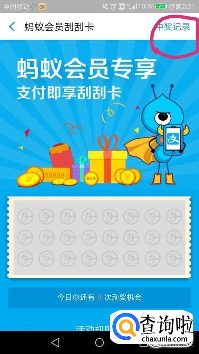 在蚂蚁会员刮刮卡界面下可以查看你是否还有刮奖机会。