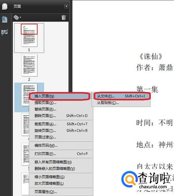 假如我们要在第3页PDF之后,插入另一个PDF文档,在缩略图中,右键点击第3页,选择“插入页面”,“从文档”。