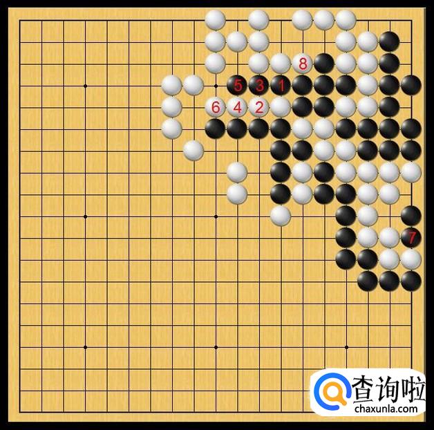 白棋这才恍然大悟,原来黑棋在中路的打吃只不过是虚晃一枪,黑棋中路打吃只是为了增加中路黑棋的气眼,目的是为了和右下角白棋的大龙拼气。于是,白棋连忙在白8处挡,白棋开始紧黑棋中腹黑棋的气了。如图所示。