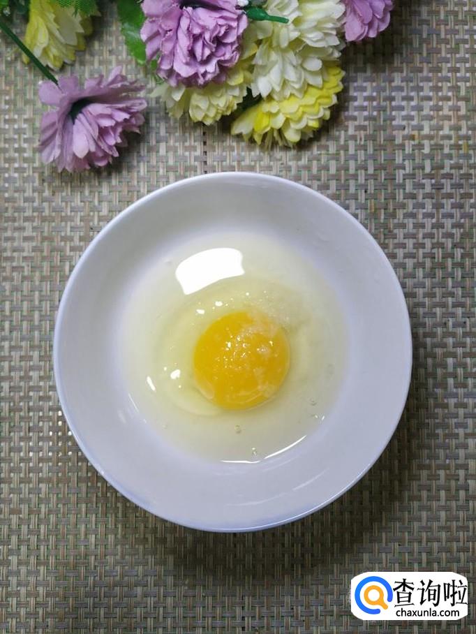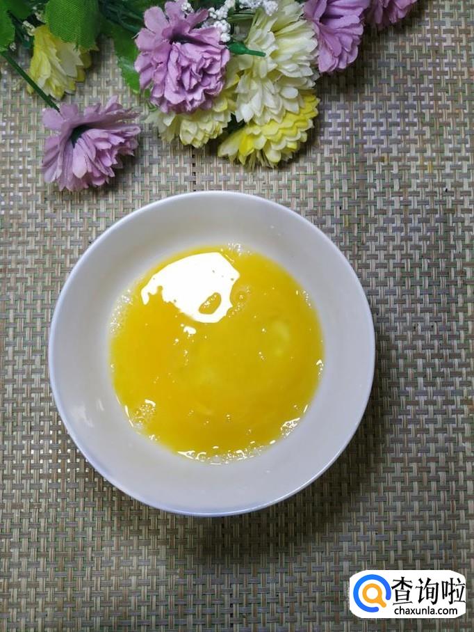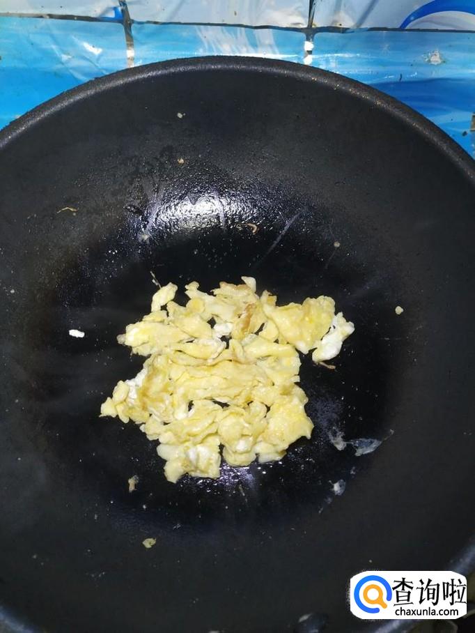 碗中打入一个鸡蛋,加入适量食盐,打散后,将鸡蛋倒入锅中,翻炒均匀,盛出备用。