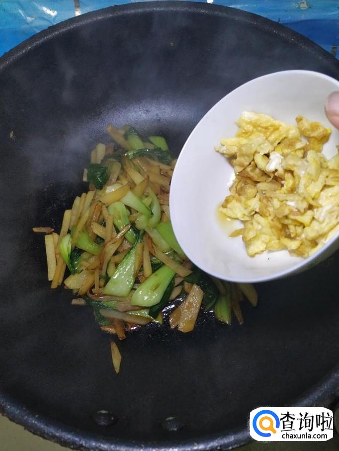 将之前炒好的鸡蛋倒入锅中,翻炒均匀,将汤汁收干。