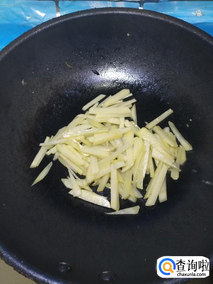 炒锅中放入适量油,油热后,将土豆条放入锅中翻炒一下,炒至表面微微发黄就差不多了。