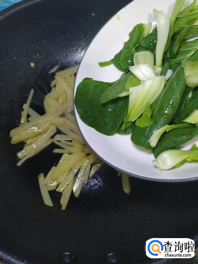 将准备好的青菜,放入锅中,和土豆条一起翻炒均匀,炒至青菜变软就差不多了。