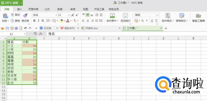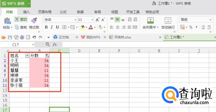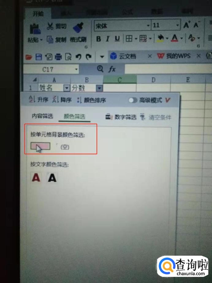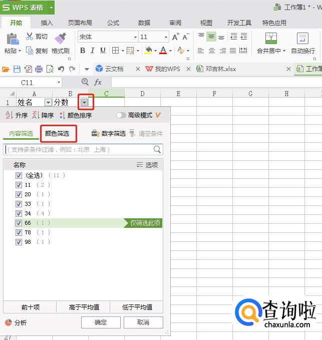 点击分数一栏旁边的“三角形”,选择【颜色筛选】,点击刚刚填充的色块,这样就把重复的数据筛选出来了。