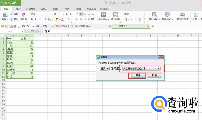 为筛选出来的重复值设置填充颜色,点击【确定】。