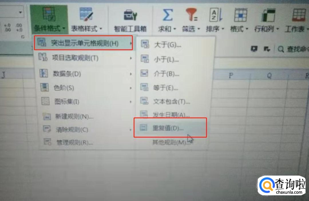 选择条件格式中的【突出显示单元格规则】--【重复值】。