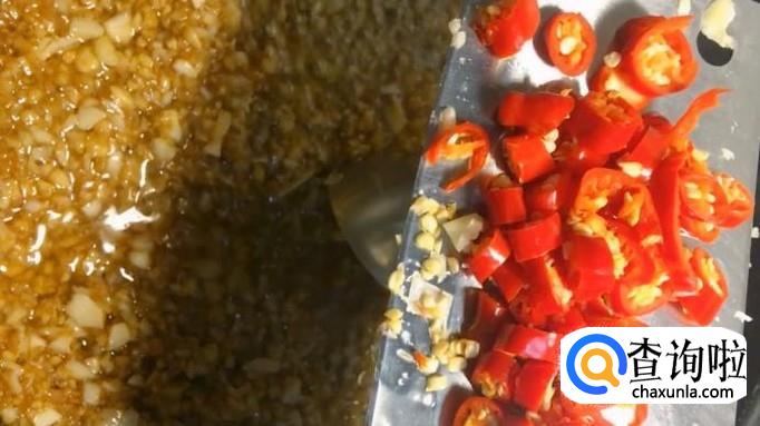 再将炒好的蒜末用勺子均匀的浇在粉丝上。