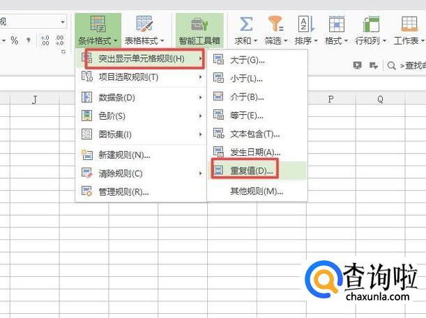 然后我们点击突出显示单元格格式,然后我们点击重复值;