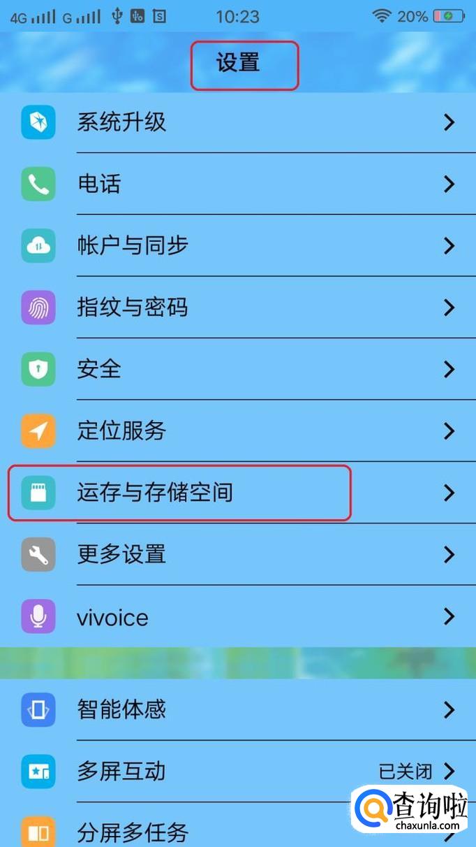 此时,我们打开手机设置,点击“运存与存储空间”。