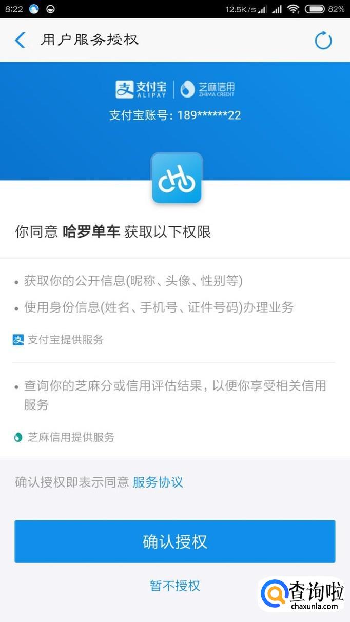 然后点击确认让哈罗单车查询芝麻信用分,只要满600分即可面押金骑行。