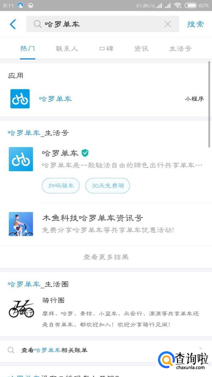 在搜索框里面用输入法输入哈罗单车,点击选择哈罗单车小程序。