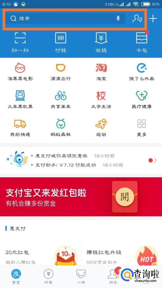 我们首先打开支付宝,因为这里会用到支付宝的免押金服务,点击搜索框。