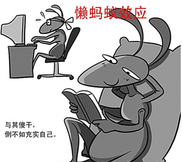 蚂蚁王国如此,人类社会更是如此。这就是所谓的“懒蚂蚁效应”。在任何一个组织里,“勤者”与“懒者”都是不可缺少的。辛勤劳作是一个 组织赖以生存的基本条件,但组织的生存与发展还需要某些成员去分析、决策 和创新,而只有从忙碌的杂务、琐事和具体事务中解脱出来,才有时间和精力 完成这类工作。