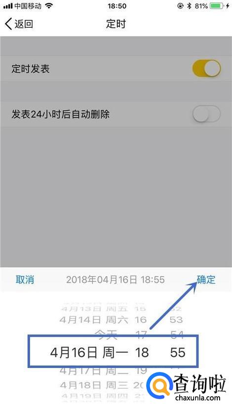 然后选择你要发表说说的时间并点击确定,如下图所示。