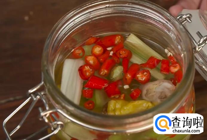 接着,准备一个密封罐,倒入泡椒水,再加白糖、小辣椒和芹菜。