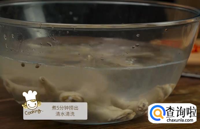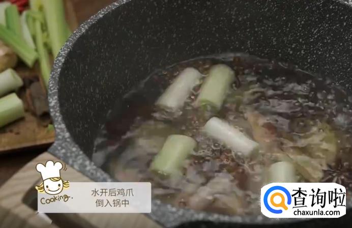 待水烧开后,将鸡爪倒入锅中,煮5分钟后捞出来,用清水进行清洗。