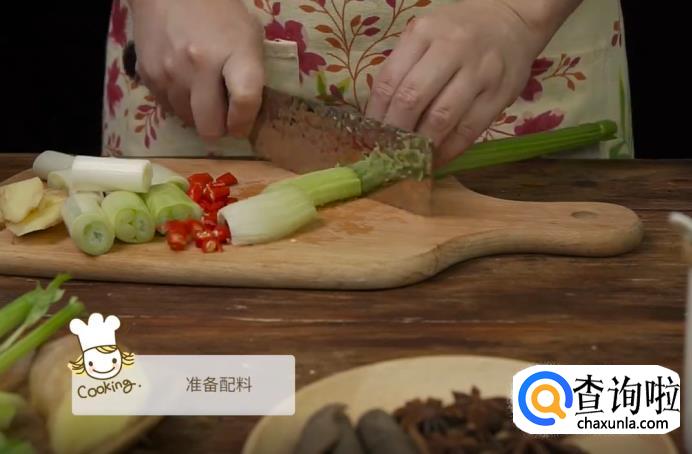 接着准备配料,将大葱和芹菜切成段,姜切片,小米椒切碎。