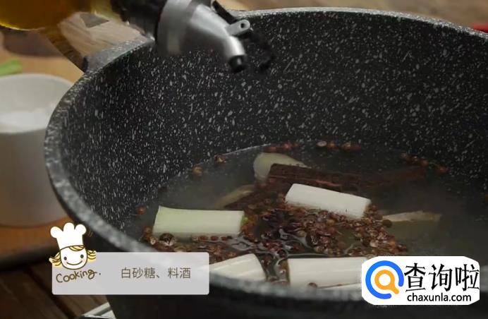 烧一锅水,将花椒、桂皮、大葱和姜倒入,再加入白砂糖和料酒,一起煮开。