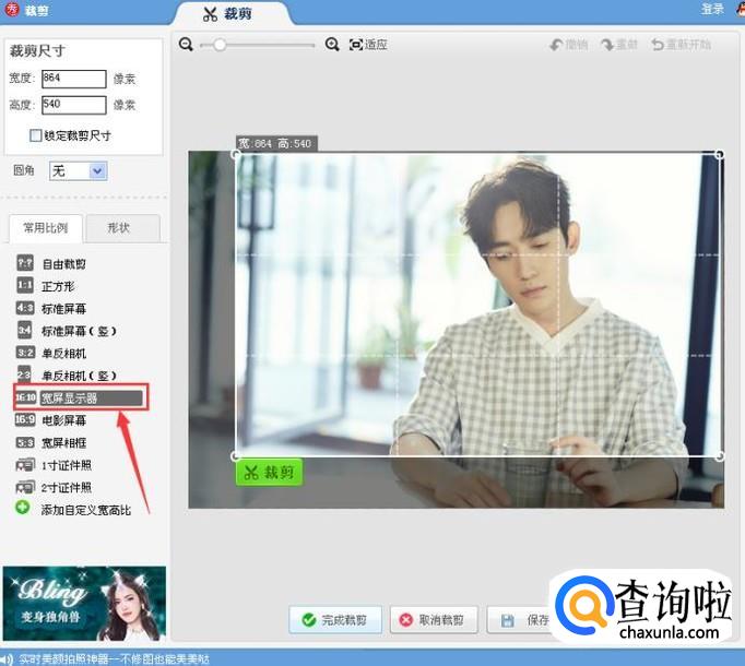 点击“宽屏显示器”,之后对图片的位置进行调整,最后点击“裁剪”。