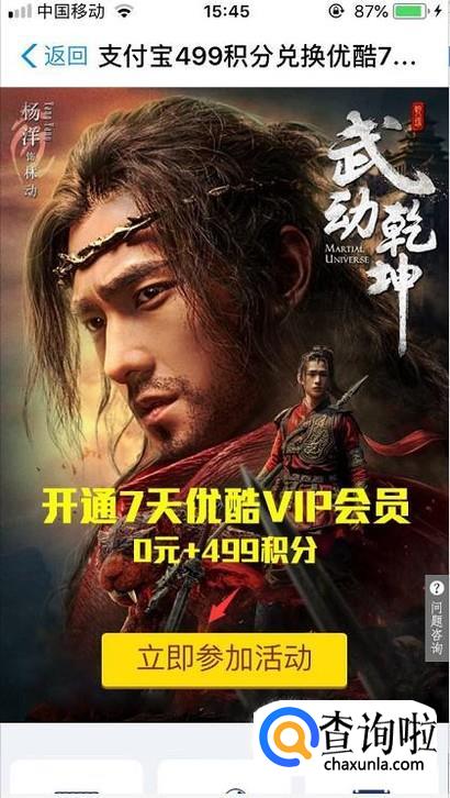 最后我们只需要点击立即参加活动即可,不用花钱,蚂蚁积分也会自动扣除,登录优酷的使用使用支付宝账号登录即可。