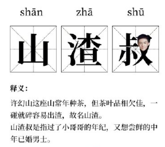 电视剧《三十而已》里许幻山这座山常年种茶,但茶叶品相欠佳,一碰就碎容易出渣,故名山楂。山楂叔是指过了小哥哥的年纪,又想尝鲜的中年已婚男士。
