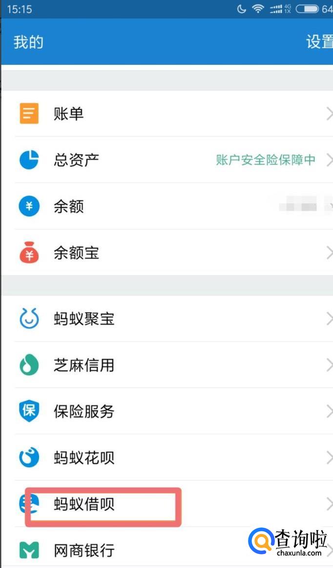 打开支付宝后,点击我的,往下拉出现一个蚂蚁借呗;
