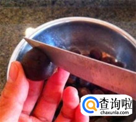 用一把剪刀对准栗子的中间部位剪一下,或者是刀子割一下也行,我保证你能够将栗子的硬壳以及里面的那层皮完整的剥下来。