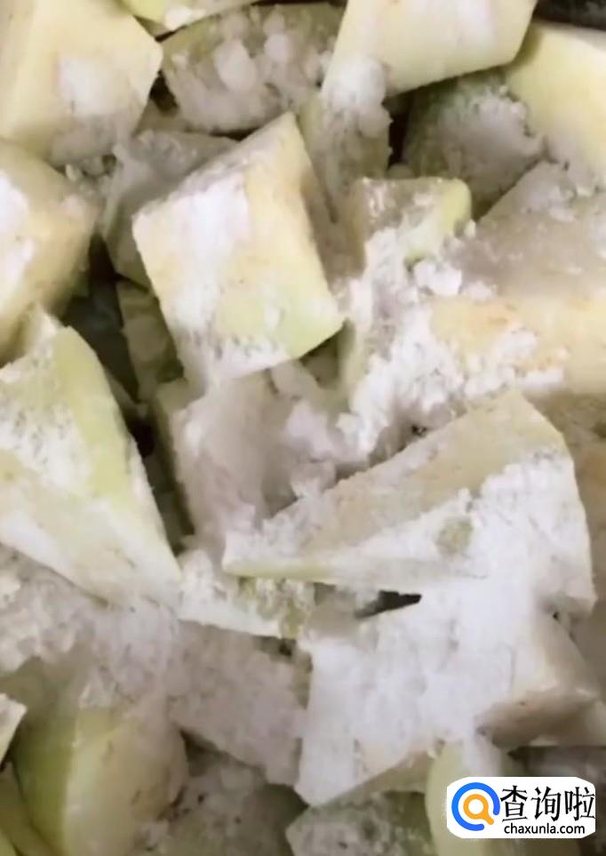 然后,我们在切好的茄子上面拍一层干淀粉