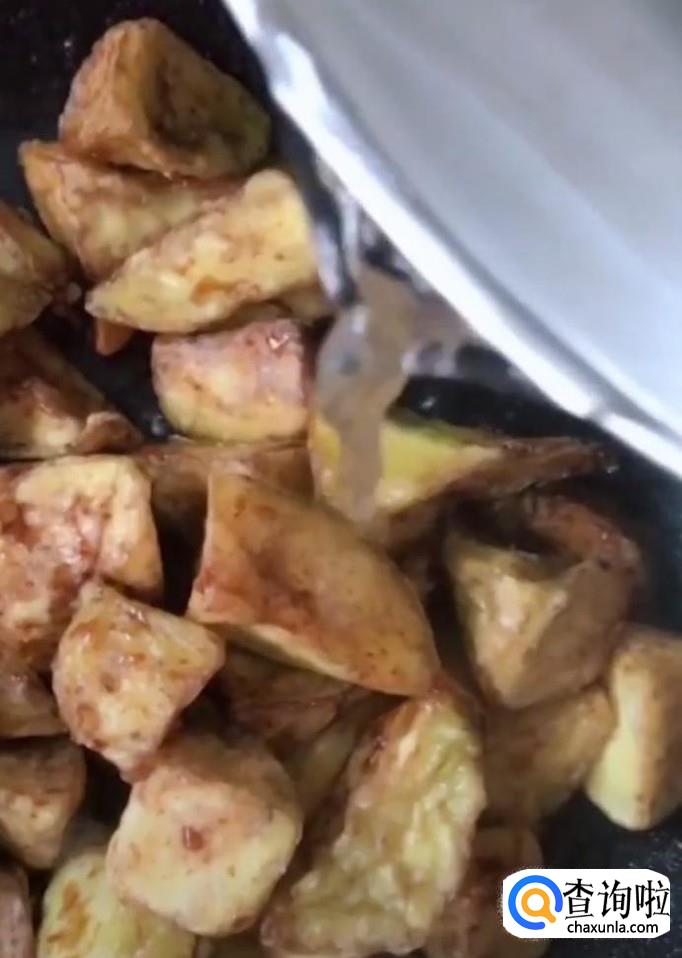 然后再放入炸好的茄子,放入适量的清水,炖两分钟
