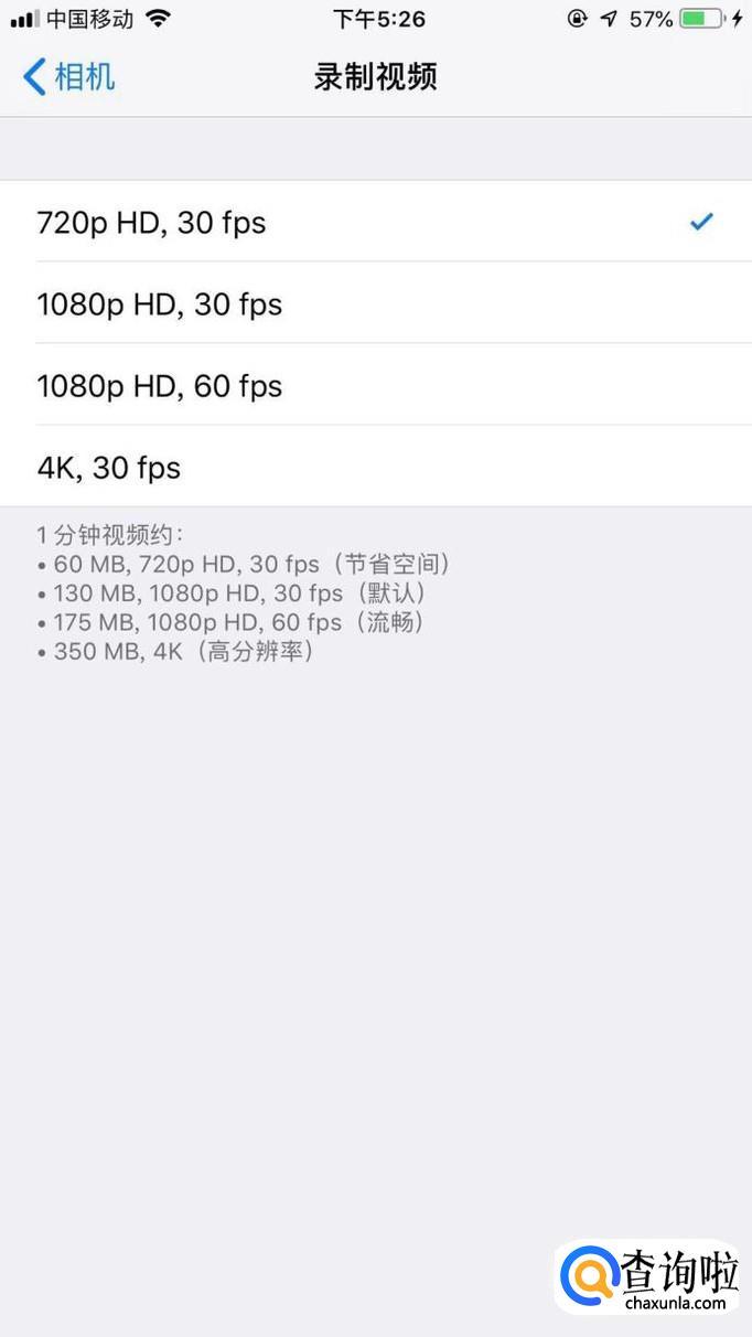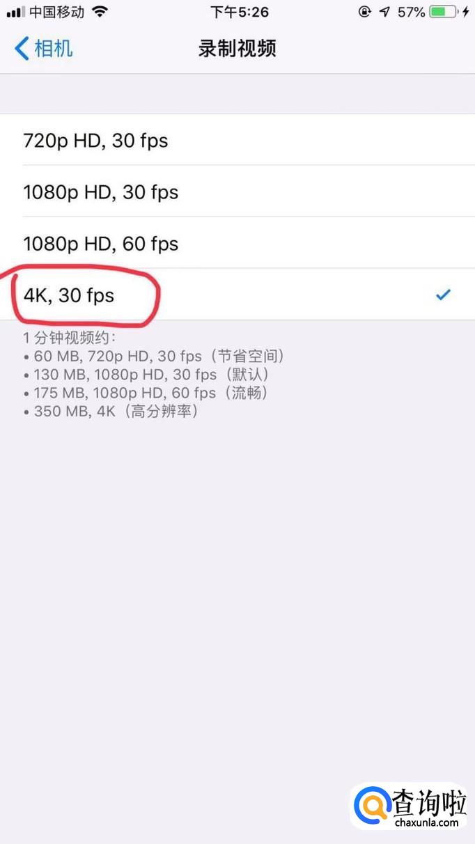 可以看到有四个选项“720p HD,30fps”“1080p HD,30fps”“1080p HD,60fps”“4K,30fps”,我们选择最后一个,也就是“4K,30fps”。