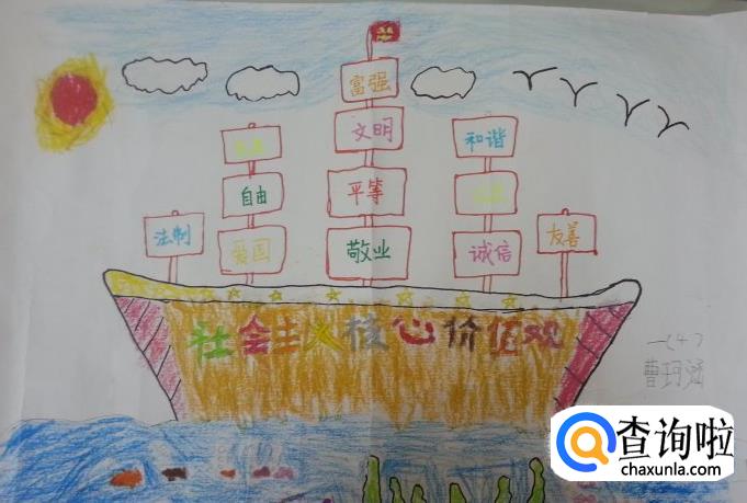 以一艘船为主体,船体上写上社会主义核心价值观,船的桅杆上写上核心价值观的内容,辅以蓝天白云和火红的太阳。