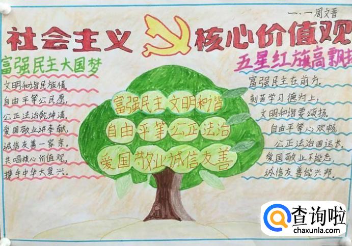 可以在中间画一颗绿色的树,两边安排文字排列,最上面写上社会主义核心价值观。