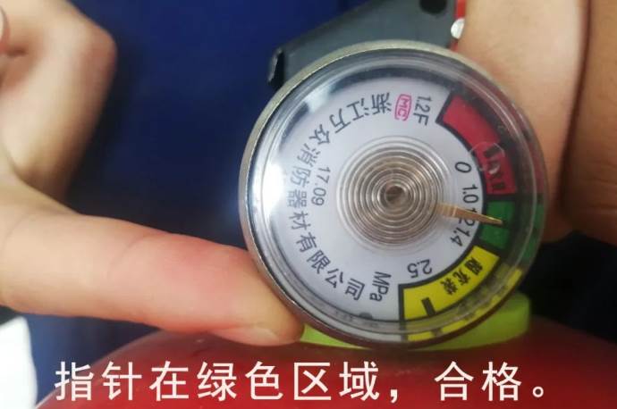 2、灭火器的压力表的指针是否在绿区,否则应充装驱动气体。