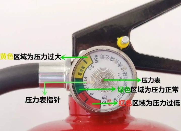 灭火器压力表红色区域:表示灭火器内干粉压力较小,已经失效;绿色区域:表示压力正常,灭火器可以正常使用;黄色区域:表示灭火器内的压力过大,有爆破、爆炸的危险。