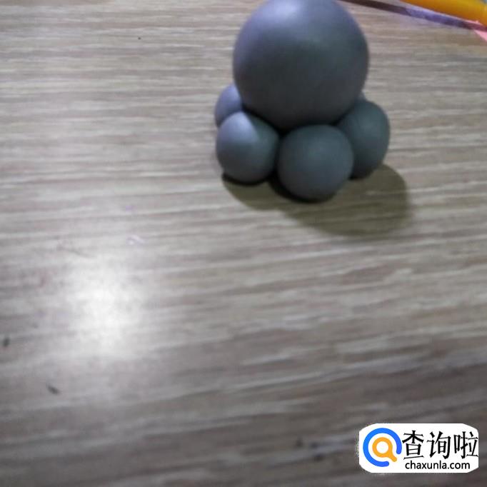 将这6个小球按顺序粘在大的球上方,如下图所示,由于刚刚开封的软陶粘性很强,所以我们不需要等胶水即可粘上。