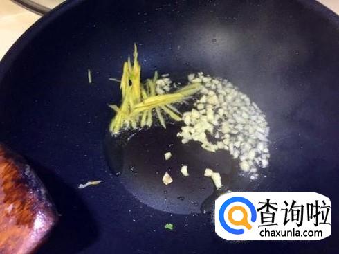 锅里放油烧热,油不用太多,然后将切好的姜丝和多一些的蒜末放进油里,不断地翻炒,让蒜香味更浓。