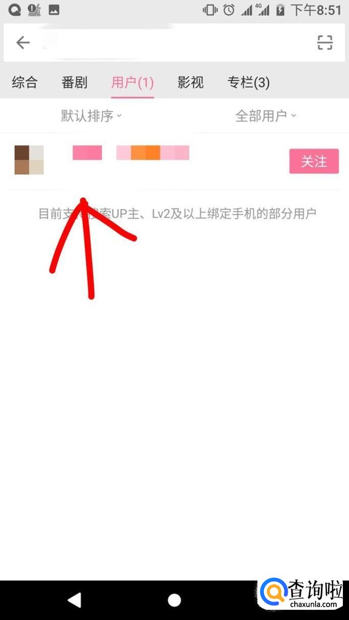 搜索之后,如果你打的是up主的全名,那么视频一般是什么都没有的,这时点击旁边的用户,这是你会发现那个被你拉黑的up主,然后点进去。