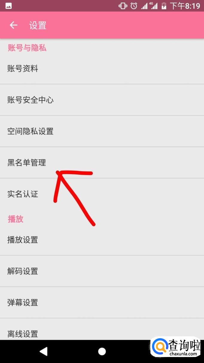 点进去之后会出现好多关于你使用这个软件的一些个人设置,我们在这些选项里找到账号和隐私大标题,然后在这个大标题下找到黑名单设置,点击进去。