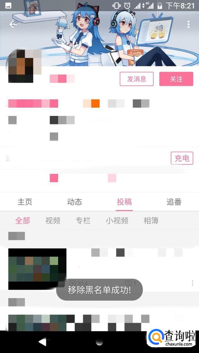 这时你会发现下面出现了移除黑名单成功,这样你就把一不小心加到黑名单的up移除黑名单啦。