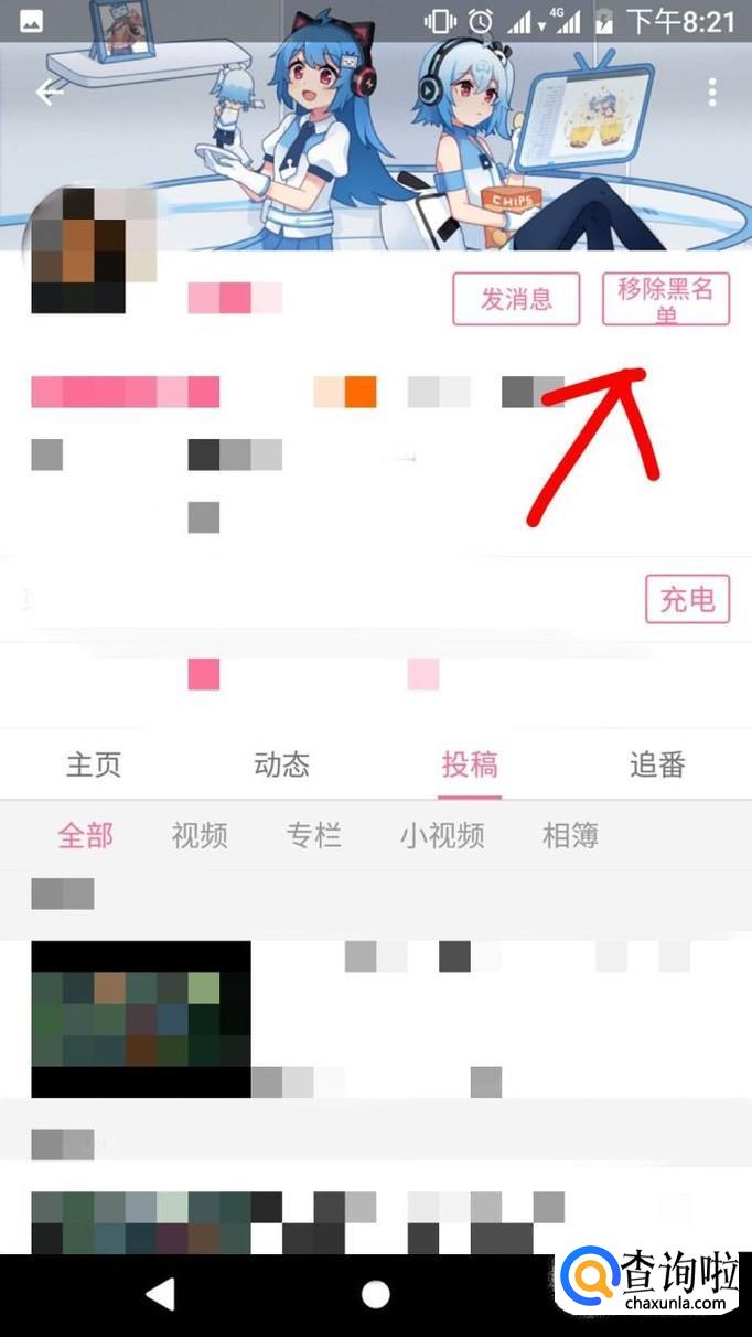点进去之后,你会在这个up主的主页发现他发的视频,还有他的投稿,在他主页的右上角你会发现之前的关注变成了取消拉黑,点击。