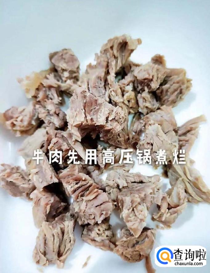 首先把牛肉洗干净,用高压锅煮烂,撕成小块,如下图所示。
